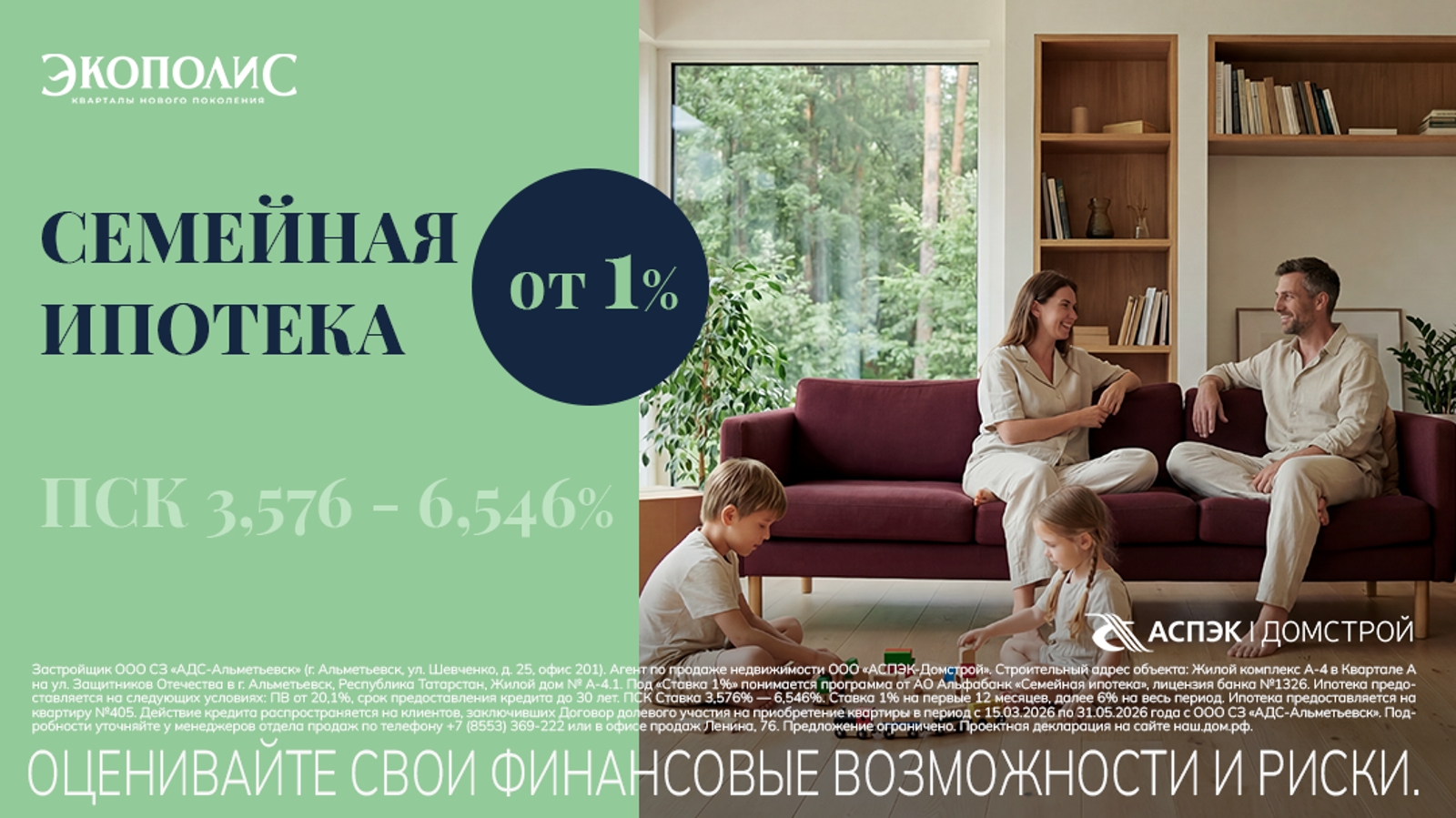 Застройщик ООО СЗ «АДС-Альметьевск» (г. Альметьевск, ул. Шевченко, д. 25, офис 201). Агент по продаже недвижимости ООО «АСПЭК-Домстрой». Строительный адрес объекта: Жилой комплекс А-4 в Квартале А на ул. Защитников Отечества в г. Альметьевск, Республика Татарстан, Жилой дом № А-4.1. Под «Ставка 1%» понимается программа от АО Альфабанк «Семейная ипотека», лицензия банка №1326. Ипотека предоставляется на следующих условиях: ПВ от 20,1%, срок предоставления кредита до 30 лет. ПСК Ставка 3,576% — 6,546%. Ставка 1% на первые 12 месяцев, далее 6% на весь период. Ипотека предоставляется на квартиру №405. Действие кредита распространяется на клиентов, заключивших Договор долевого участия на приобретение квартиры в период с 15.03.2026 по 31.05.2026 года с ООО СЗ «АДС-Альметьевск». Подробности уточняйте у менеджеров отдела продаж по телефону +7 (8553) 369-222 или в офисе продаж Ленина, 76. Предложение ограничено. Проектная декларация на сайте наш.дом.рф. ОЦЕНИВАЙТЕ СВОИ ФИНАНСОВЫЕ ВОЗМОЖНОСТИ И РИСКИ.